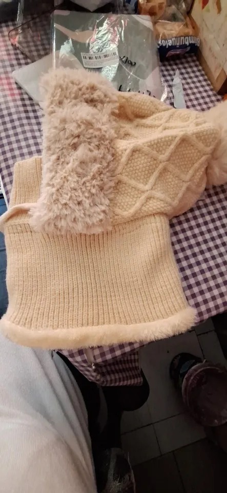 I bought this as a gift, and it corresponds the pictures. It is warm and cozy, seems to be very useful and convenient, it is also not too tight. My only criticism is that it sheds the fur a little, but I don't think that's a big deal.